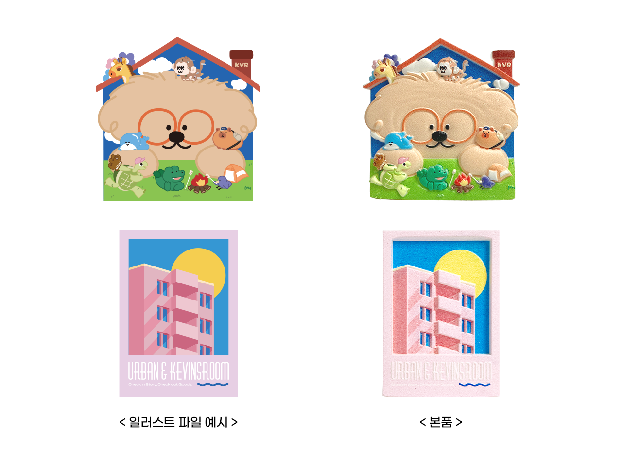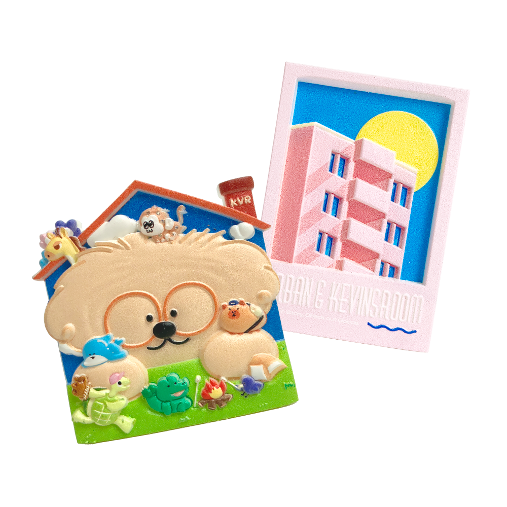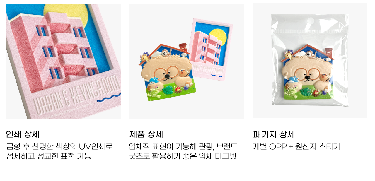 양각·음각 표현이 가능한 입체 마그넷입니다. 정교한 금형 작업 후 선명한 색상의 UV 인쇄로 제작되어 원하는 컬러와 디자인을 섬세하게 구현할 수 있습니다.