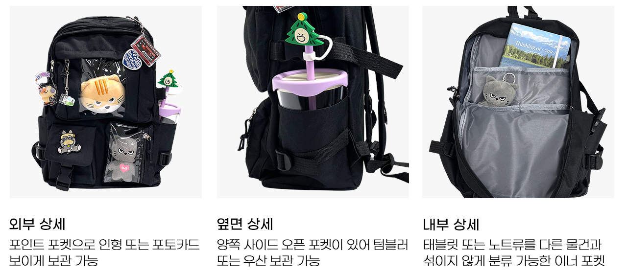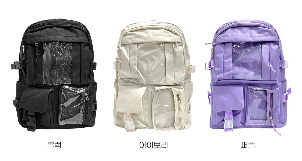 베이직한 실루엣에 투명 포켓이 있어, 인형 또는 포토카드를 보이게 넣어둘 수 있어 포인트 가방으로도 가능한 이타백 백팩입니다.