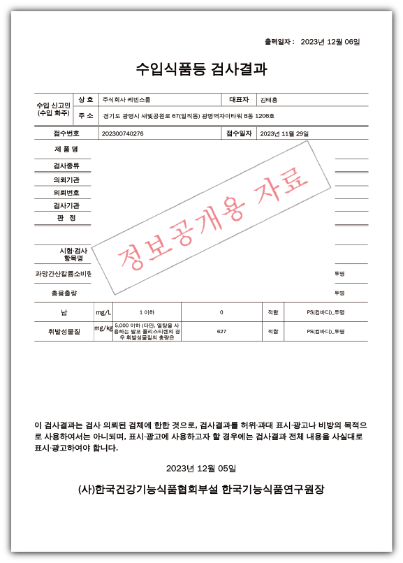 본사에서 제작 중인 피크닉 와인잔세트(투명)에 대해 시험성적서를 통한 유해성분 안전 인증 PASS를 받았습니다.
