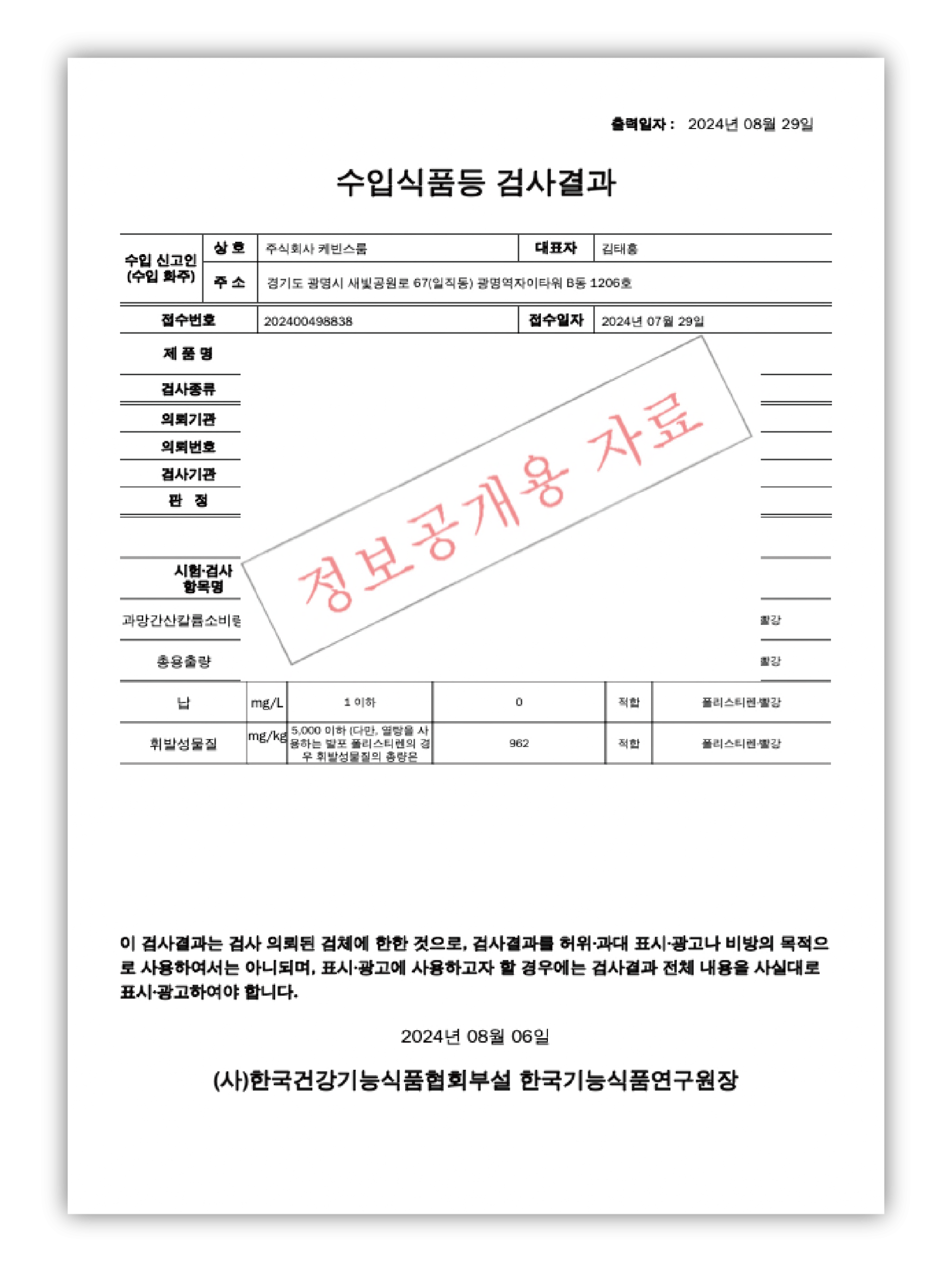 본사에서 제작 중인 플라스틱 머들러(레드)에 대해 시험성적서를 통한 유해성분 안전 인증 PASS를 받았습니다.