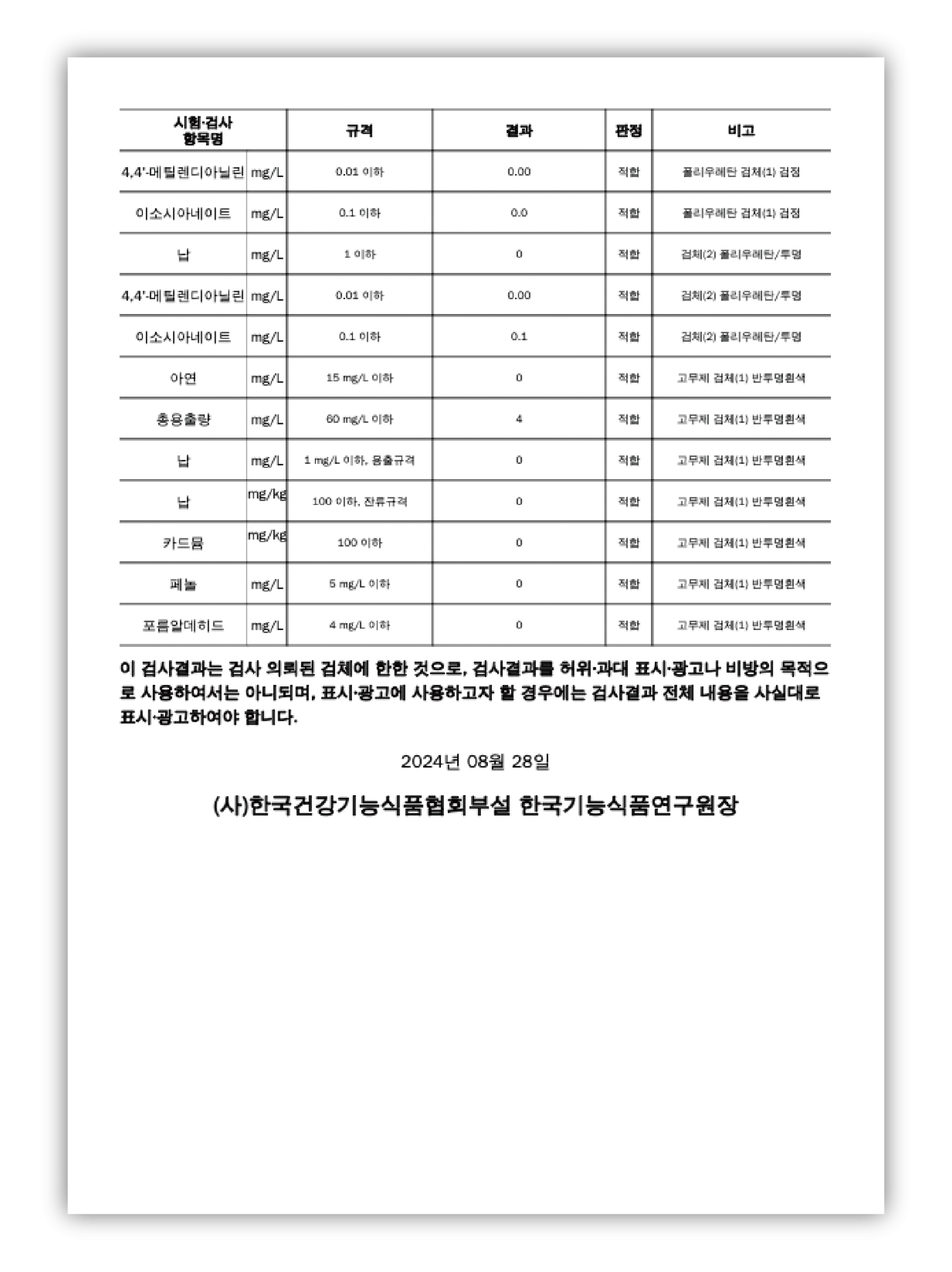 본사에서 제작 중인 소프트 플라스크(블랙)에 대해 시험성적서를 통한 유해성분 안전 인증 PASS를 받았습니다.