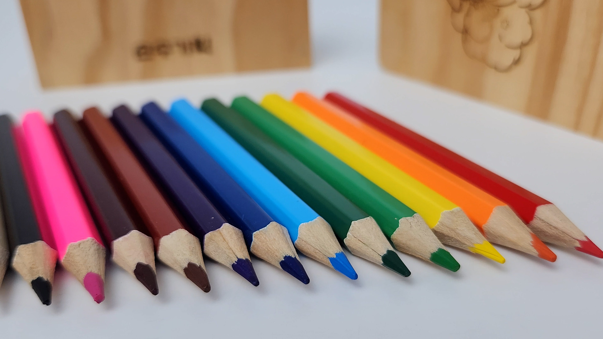 원목으로 제작된 12색 미니 색연필입니다. 연필깎이가 케이스에 내장되어 있어 따로 들고 다닐 필요가 없으며 사선 디자인으로 만져도 손이 베이지 않습니다.